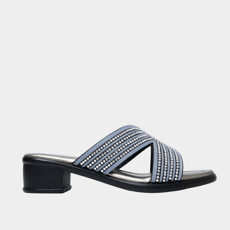 This features a bedazzled strappy design and 1.5 inch block heels.