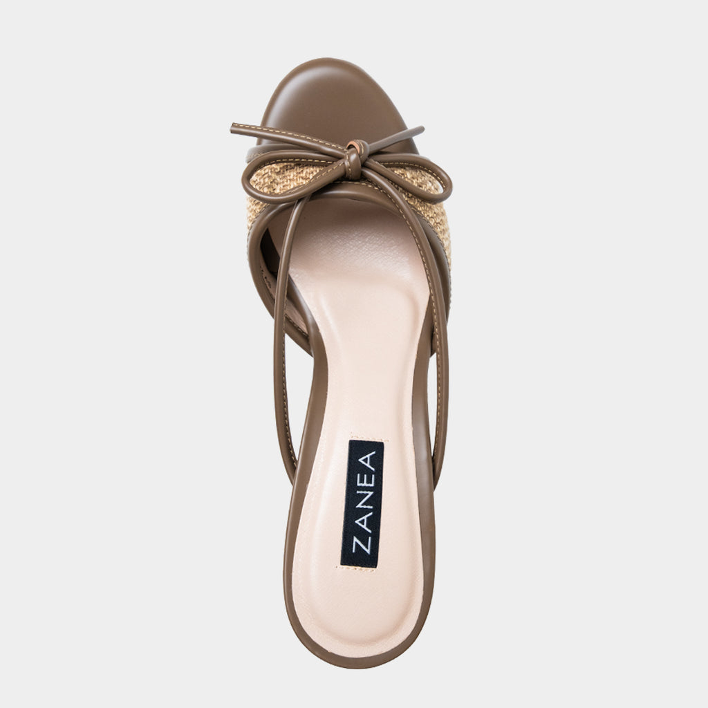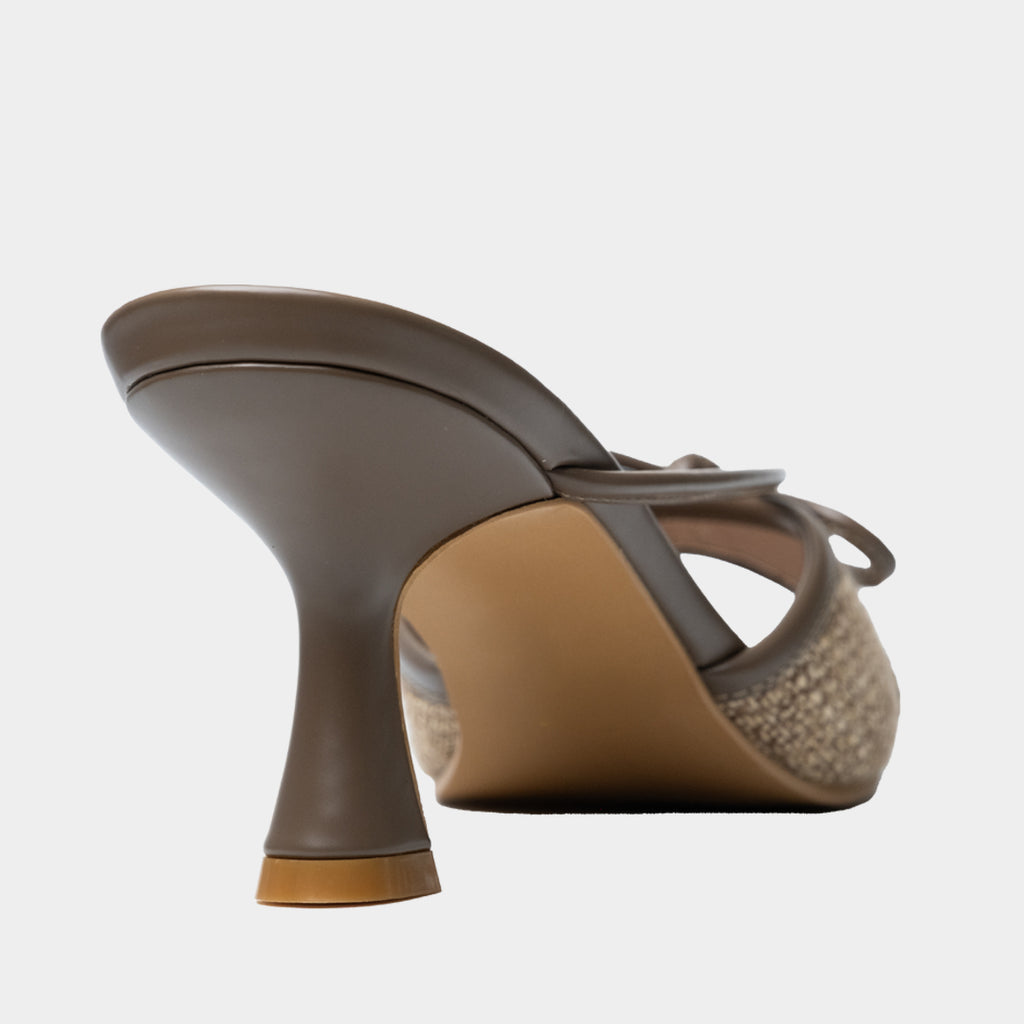 The Ocean Mules feature a unique woven material and a feminine bow accessory.