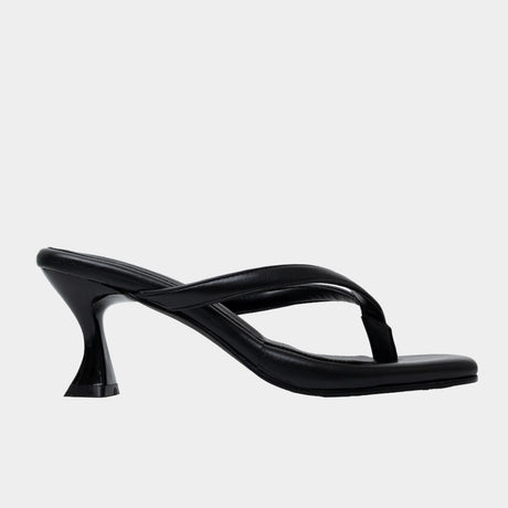 The Carrie heeled sandals feature a sleek thong strap design and 2.5 inch flare stiletto heels.