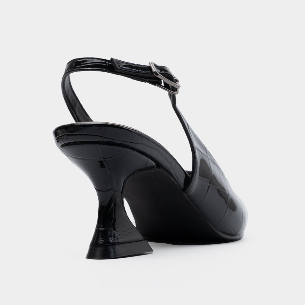 These feature a crocodile effect material and 2.5 inch flare heels.