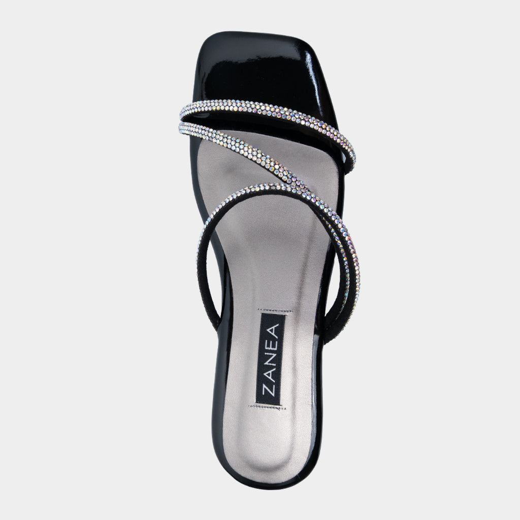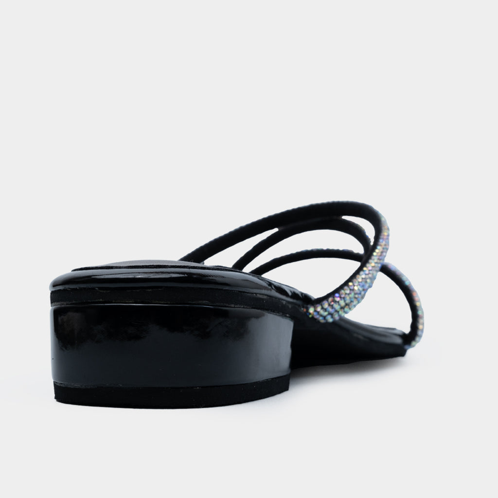 The comfortable 1 inch block heel is elevated with its studded and glittery straps and asymmetrical designs.