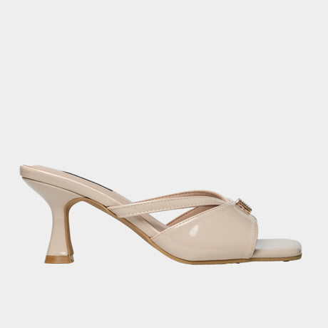 These feature a double strap design with a gold accessory and 2.5 inch stiletto heels.